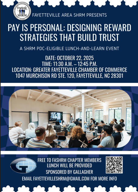 Join Fayetteville Area SHRM for Pay is Personal: Designing Reward Strategies that Build Trust, an in-person lunch presentation led by Gallagher’s Elizabeth Stillwell that focuses on crafting total rewards strategies that enhance organizational trust and employee engagement.