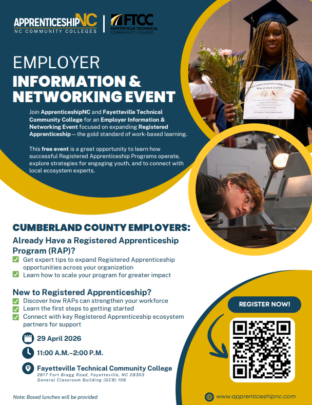 Calling all Cumberland County employers and HR leaders! Are you looking for new ways to build a strong, future-ready talent pipeline? Join ApprenticeshipNC and Fayetteville Technical Community College for an Employer Information & Networking Event focused on expanding Registered Apprenticeship—the standard of work-based learning.